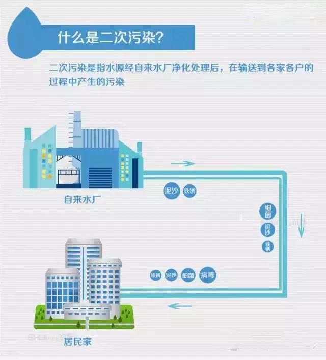 顧名思義,二次污染是指水源經(jīng)自來水廠凈化處理后,在輸送到各家各戶的過程中產(chǎn)生的污染。主要是一些水管老化出現(xiàn)的鐵銹、泥沙、細(xì)菌、病毒等雜質(zhì)和自來水廠氯制劑消毒后的副產(chǎn)物。二次污染的污染源主要有自來水管道、小區(qū)二次供水系統(tǒng)和水龍頭。