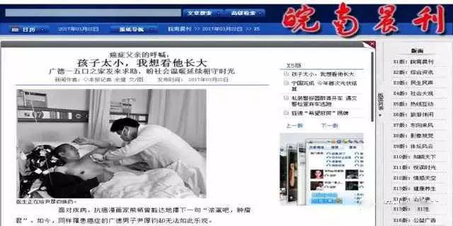 患癌癥的安徽省廣德縣男子尹厚鈞卻無法如此樂觀。父親數(shù)年前腦溢血,如今半身不遂,母親和妻子體弱多病,兒子今年13歲,由浙江商人資助正在念小學(xué)……這名45歲的中年男子,承擔(dān)著一個五口之家的家庭重?fù)?dān),卻身患霍奇金淋巴癌?!八麆倎淼臅r候情況很不好,皮下有一個13厘米長的膿包隧道,半側(cè)的肺都泡在胸水里?!薄皬乃眢w腫塊來看,應(yīng)該是在家撐了好幾個月,這么長的隧道是遠(yuǎn)遠(yuǎn)超過了常人能承受的痛感。”給他換藥的醫(yī)生劉濤說。